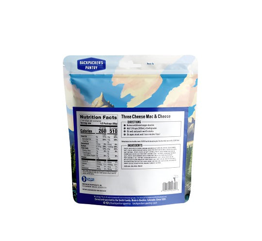 Hearty and filling, Backpacker's Pantry Three Cheese Mac & Cheese is a protein-packed freeze-dried camping food staple you'll enjoy with creamy real cheeses and elbow pasta. Whether you're at home, in the field, the cabin, or the dorms, you can't go wrong with this comfort food.