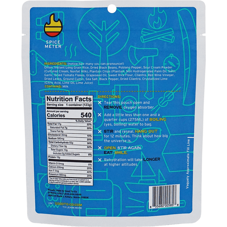 Regular price $10.75Cuban food to go? You bet. Big, bold flavors with a balanced spice take this rice bowl to new heights. The combination of rice and beans creates a complete protein providing you with the all the amino acids you need to go that extra mile. While this meal is vegetarian, even the hungriest of carnivores will appreciate the 15g of protein per serving, or 30g if you prefer a double serving. Garlic crema sauce and plantains create unique flavors you'll find in no other camp meal.