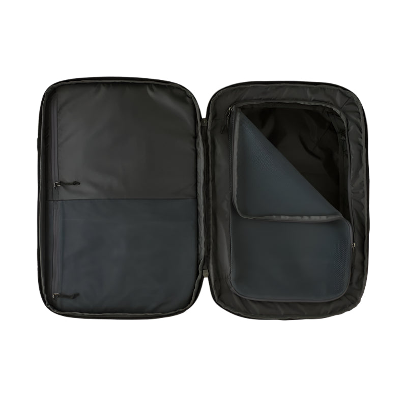 Built with recycled materials and a recycled TPU laminate; based on the maximum carry-on size of most airline carriers, and free of wheels or handles that might get in the way once you're out of the airport