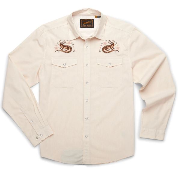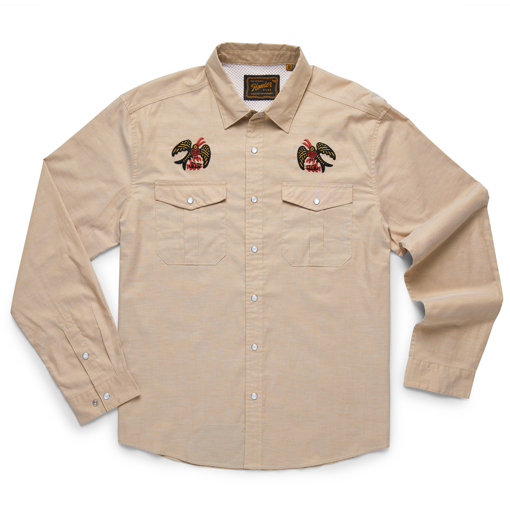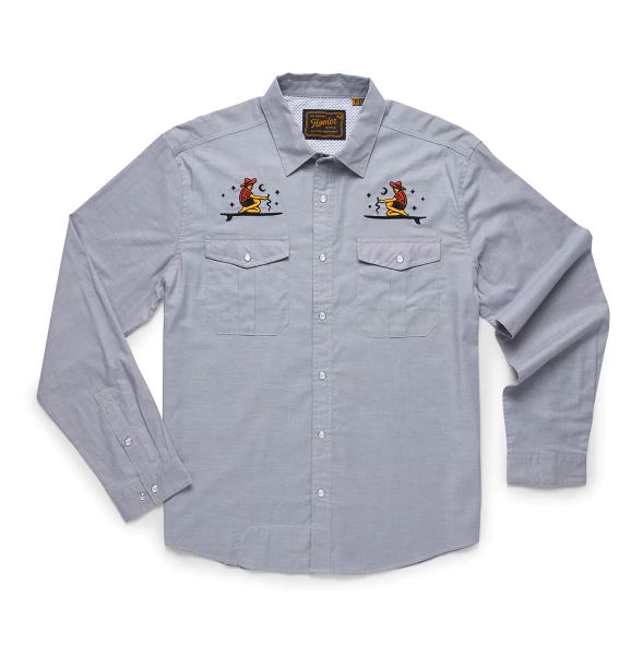 Howler Brothers desire to make the Gaucho Snapshirt was the idea that they wanted to transform the vintage western shirts of the past into something technical and wearable in everyday life while maintaining a little of their quirky nature and penchant for unique, embroidered artwork. Howler Brothers succeeded in a big way by making the Gaucho Snapshirt out of lightweight, quick drying cotton-poly blend and adding a cooling mesh-lined vented back yoke to keep it cool when the temperatures are cooking. They threw in pleated chest pockets, pearl snaps, and an ever-evolving slate of custom embroidery.