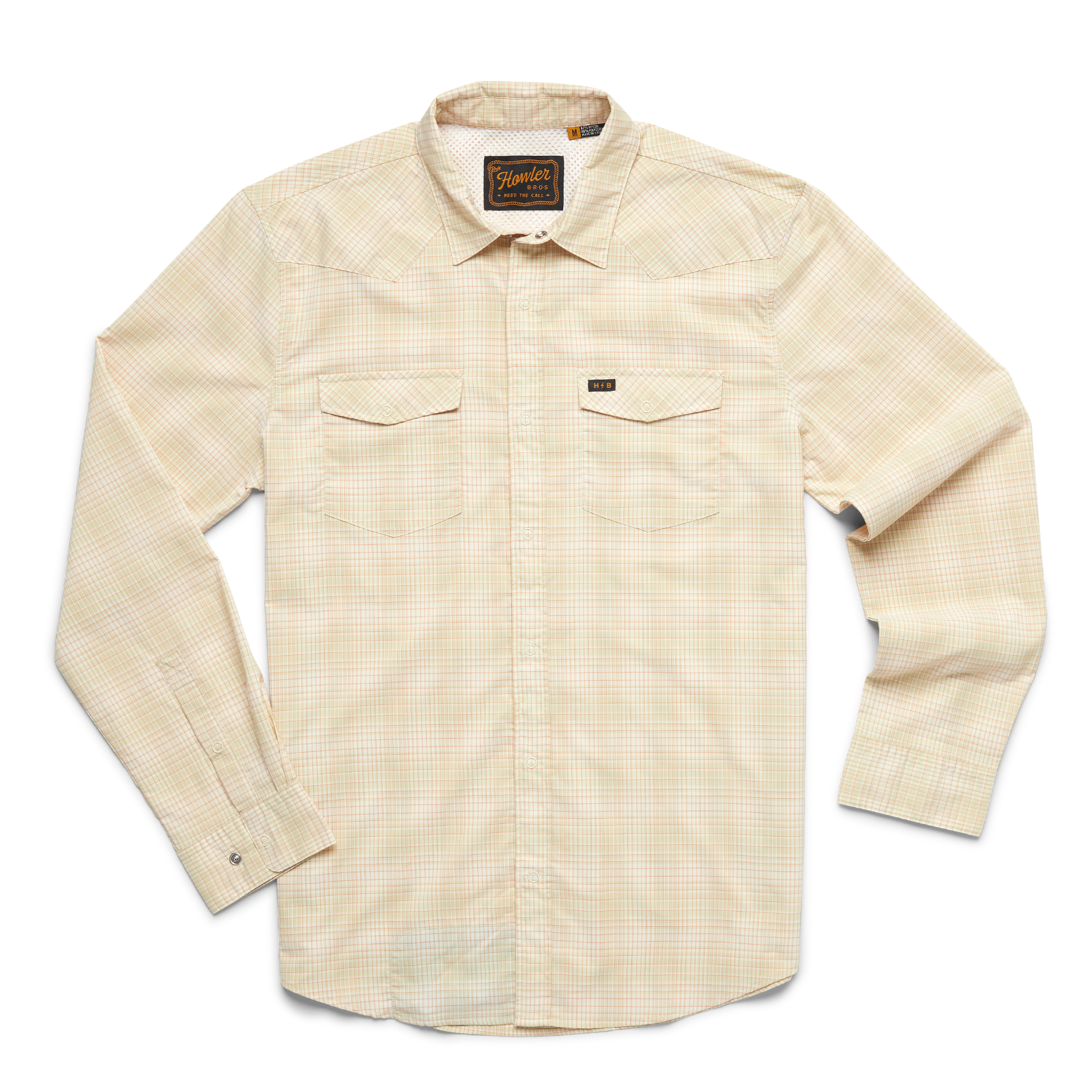 The H Bar B Tech is the technical member of Howler Brothers H Bar B family. Its lightweight stretch nylon-poly fabric, vented rear yoke and ring snaps give you an advantage over the elements without making you look like you set out to conquer the world when you're just taking care of everyday business.