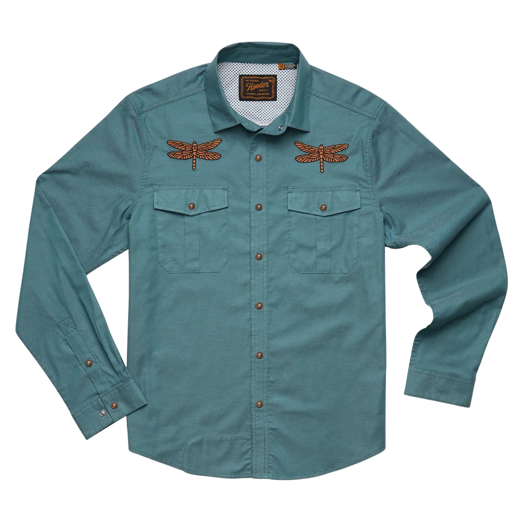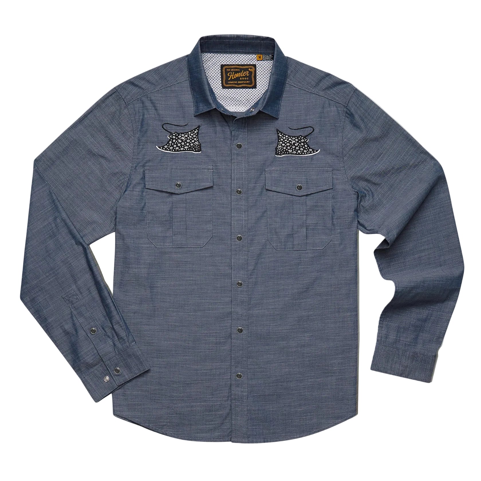 Our desire to make the Gaucho Snapshirt is one of the reasons we started Howler Brothers in the first place. We wanted to transform the vintage western shirts of the past into something technical and wearable in everyday life while maintaining a little of their quirky nature and penchant for unique, embroidered artwork. We succeeded in a big way by making ours out of lightweight, quick drying blended fabric and adding a cooling mesh-lined vented back yoke to keep it cool when the temperatures are cooking. We threw in pleated chest pockets, pearl snaps, and an ever-evolving slate of custom embroidery.