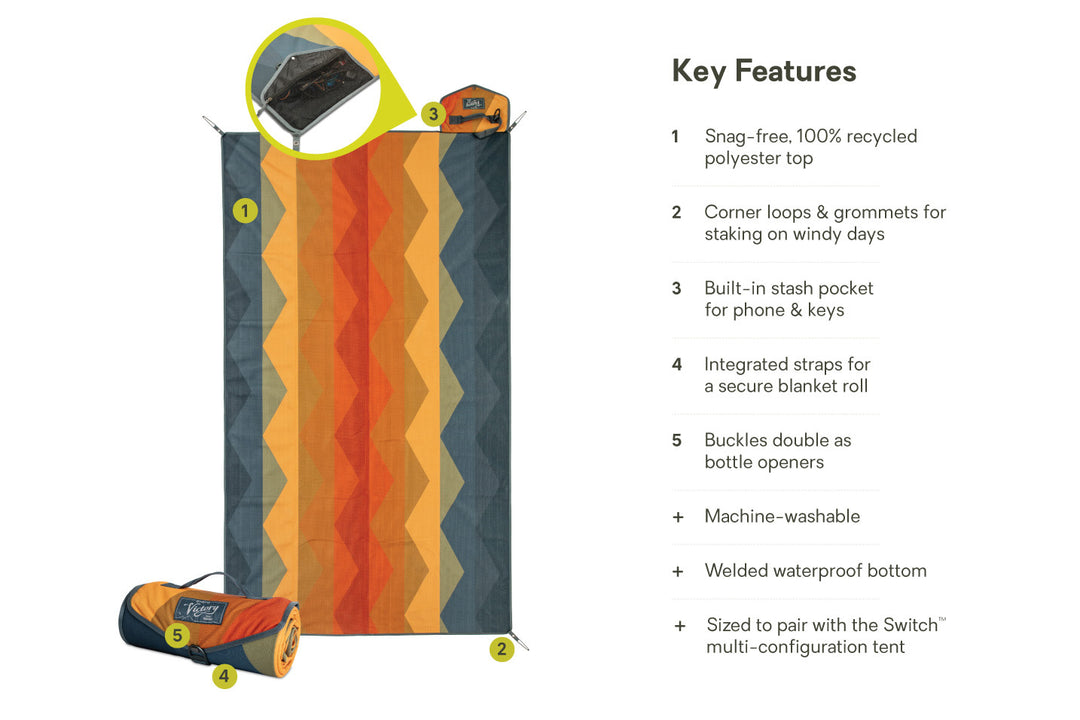 Regular price $99.95Our newest addition to the Victory Collection, the Victory™ Patio blanket is soft to the touch, durable and abundantly luxurious. It serves as a base for launching beach activities, a welcoming transition into a tent, or wall-to-wall carpeting inside your tent. The snag-free, 100% recycled PFC-free polyester top fabric is mated to a thin layer of cushioning and a fully waterproof bottom for all-terrain versatility and easy cleaning.