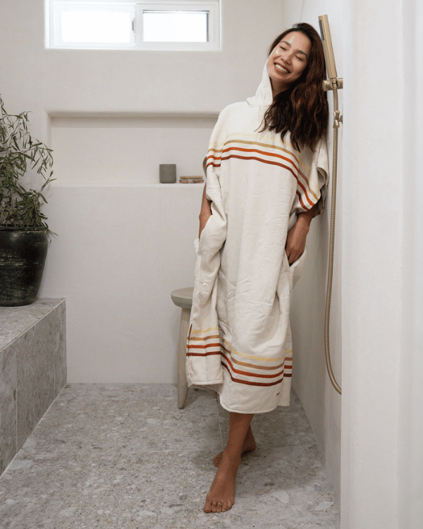 Regular price $70.00The perfect poncho does exist! Ideal for post-surf, post-shower, lounging at home or chilly days at the beach, this natural hooded poncho features an aqua multi-color border stripe design and is made from 100% Turkish Organic Cotton. Lightweight and multi-functional, your new favorite poncho has a flat weave face with a half looped terry back, an oversized hood, and of course - side pockets.