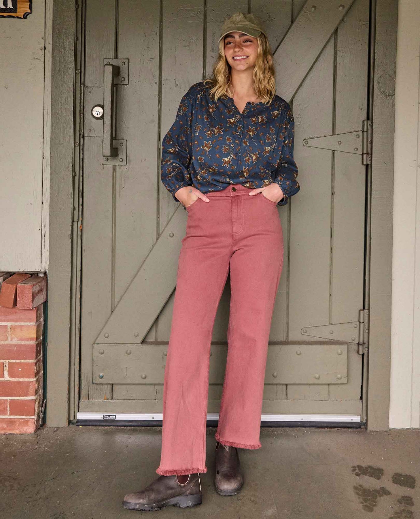 Features: Shank button closure with zip fly, raw hem