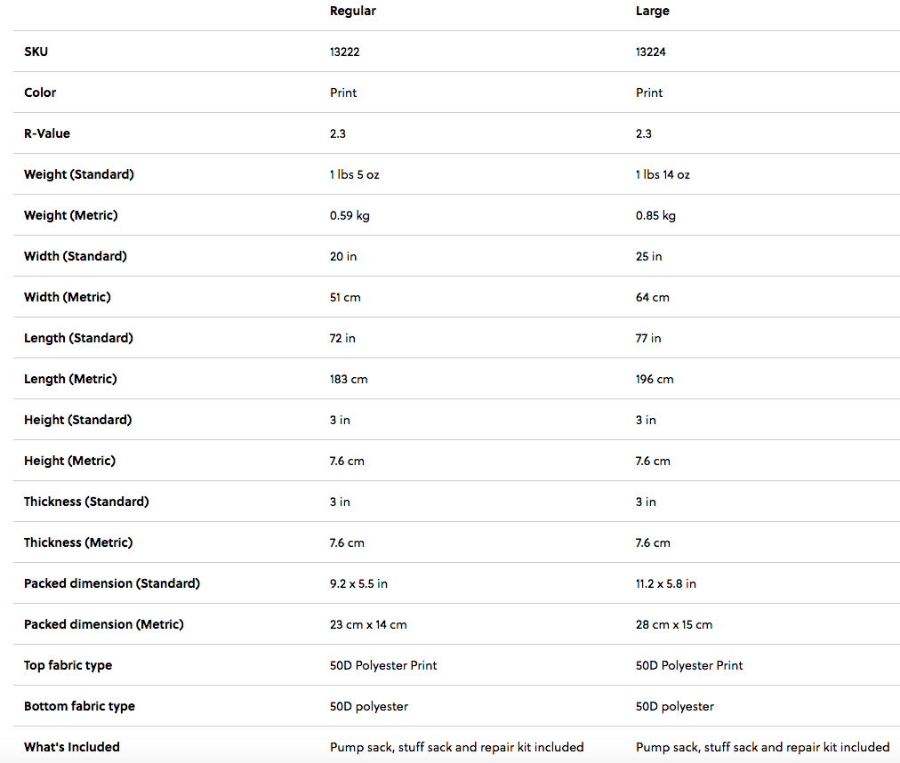 Regular price $109.98When you're looking for supreme comfort that doesn't fill up your pack, the NeoAir Topo brings three-inches (7.6 cm) of support in a pack friendly size. The rectangular-shaped pad is built with our legendary WaveCore™ construction, creating a stable and warm pad that always has your back. The 2.3 R-value pad is great for three-season camping or backpacking when you're enjoying the beauty of the outdoors. Available in several sizes, including a roomy regular wide, the Topo features the high-performance WingLock valve, which has three times the airflow rate of the classic valve, thanks to a larger opening and one-way inflation. Like all Therm-a-Rest pads, the NeoAir Topo is made in market to ensure quality and minimize environmental impact.