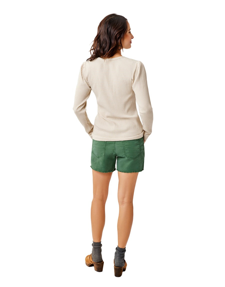 This Super Soft Ribbed knit features an easy to layer Henley neckline with the latest trending feminine puff in the shoulder.