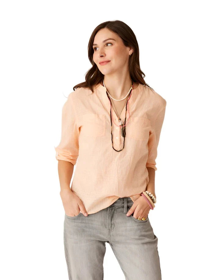 Simple sophistication make this lightweight summer top a weekend bag must. Chest pockets and three button open V-neck dial in the vibe in stride.