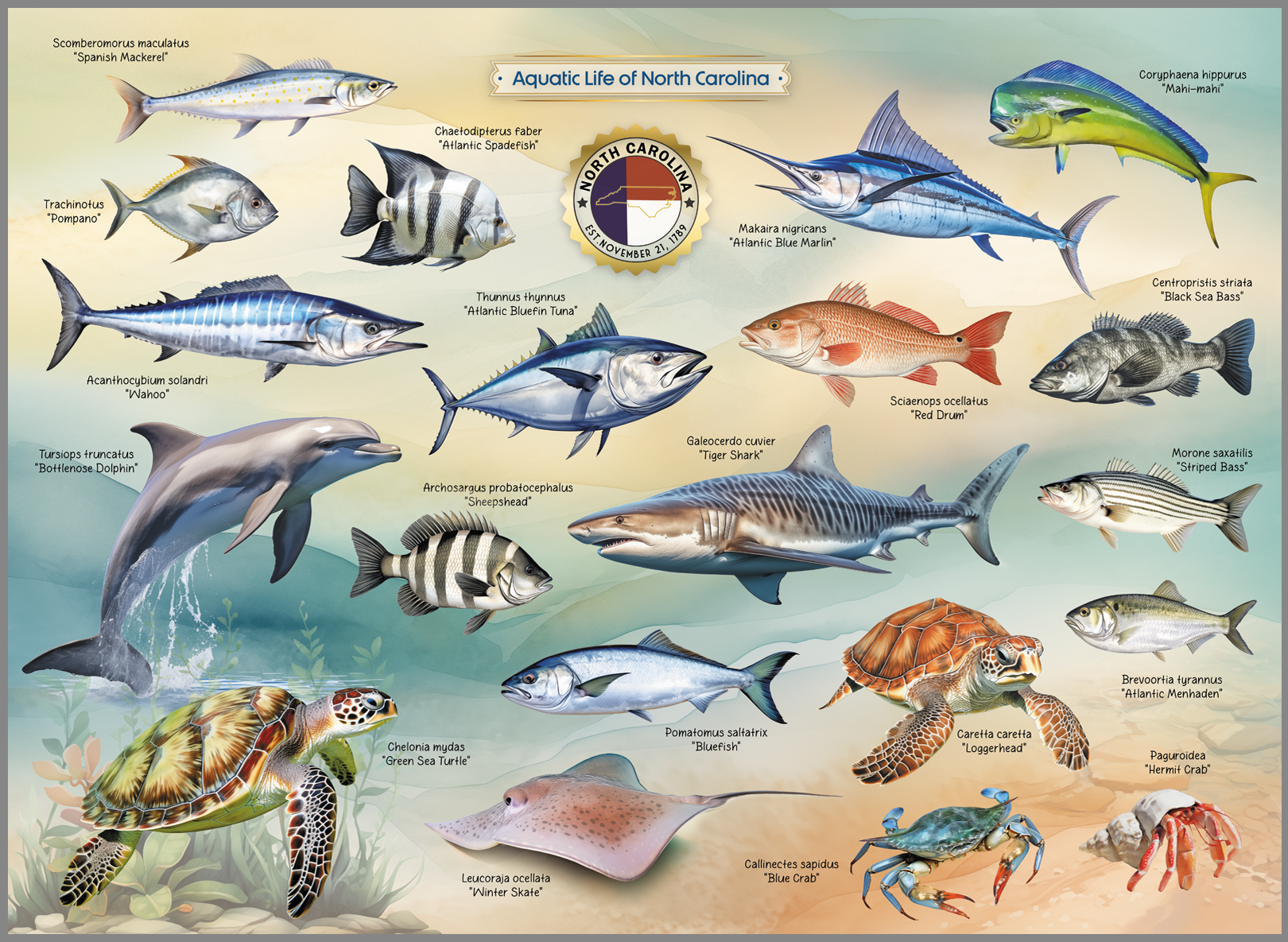 This is a collection of aquatic life we all may have the fortunate opportunity to witness in the coastal waters of North Carolina.