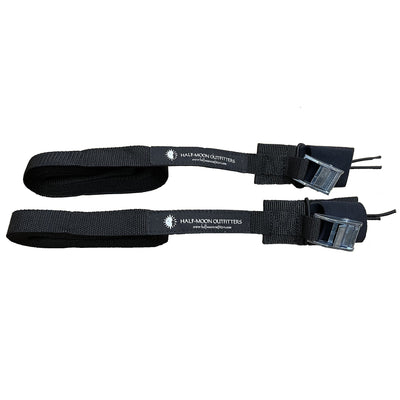 Neoprene pad covering buckle and a bungee cord with lock to hold excess webbing. Angle cut end for easy threading. Logo area is 4 x .75" on a sewn-on fabric patch. Sold in pairs with a poly bag and header.